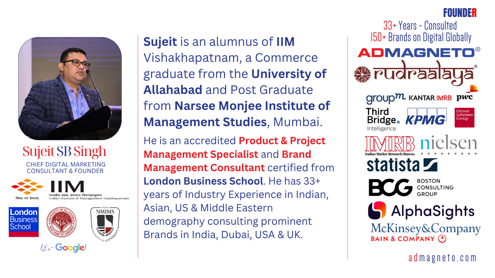 After successfully scaling AdMagneto, he now focus on his personal brand as a Business Management Consultant — specialising in Marketing, Media, Sales, Pre IPO Product, and Project Management. I work selectively with business houses, MNCs, knowledge management consulting firms, and government & political leaders on strategy, research, and high-impact launch campaigns powered by AI and data-driven insights.